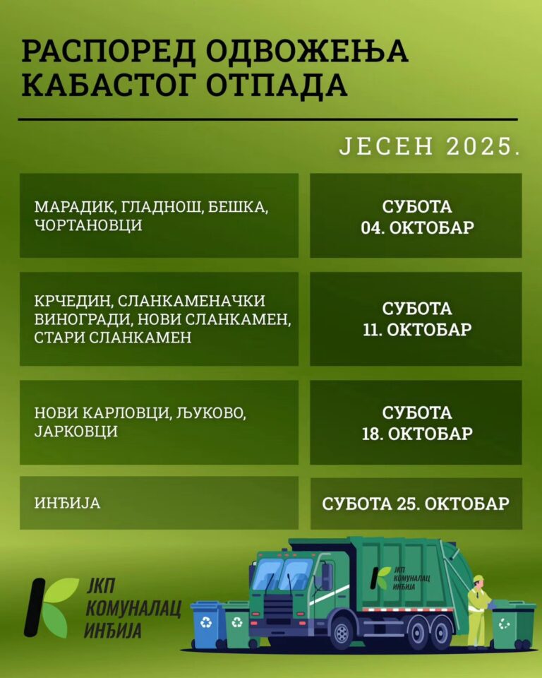 Јавно комунално предузеће „Комуналац“ Инђија објавило је јесењи распоред одвожења кабастог отпада за 2025. годину. Акција ће се спроводити сваке суботе у октобру, а обухвата сва насељена…
