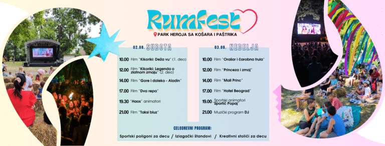 У Парку хероја са Кошара и Паштрика у Руми одржаће се Румфест, фестивал намењен породицама и љубитељима филма и забаве. Субота, 2. август: Дан почиње филмским пројекцијама…