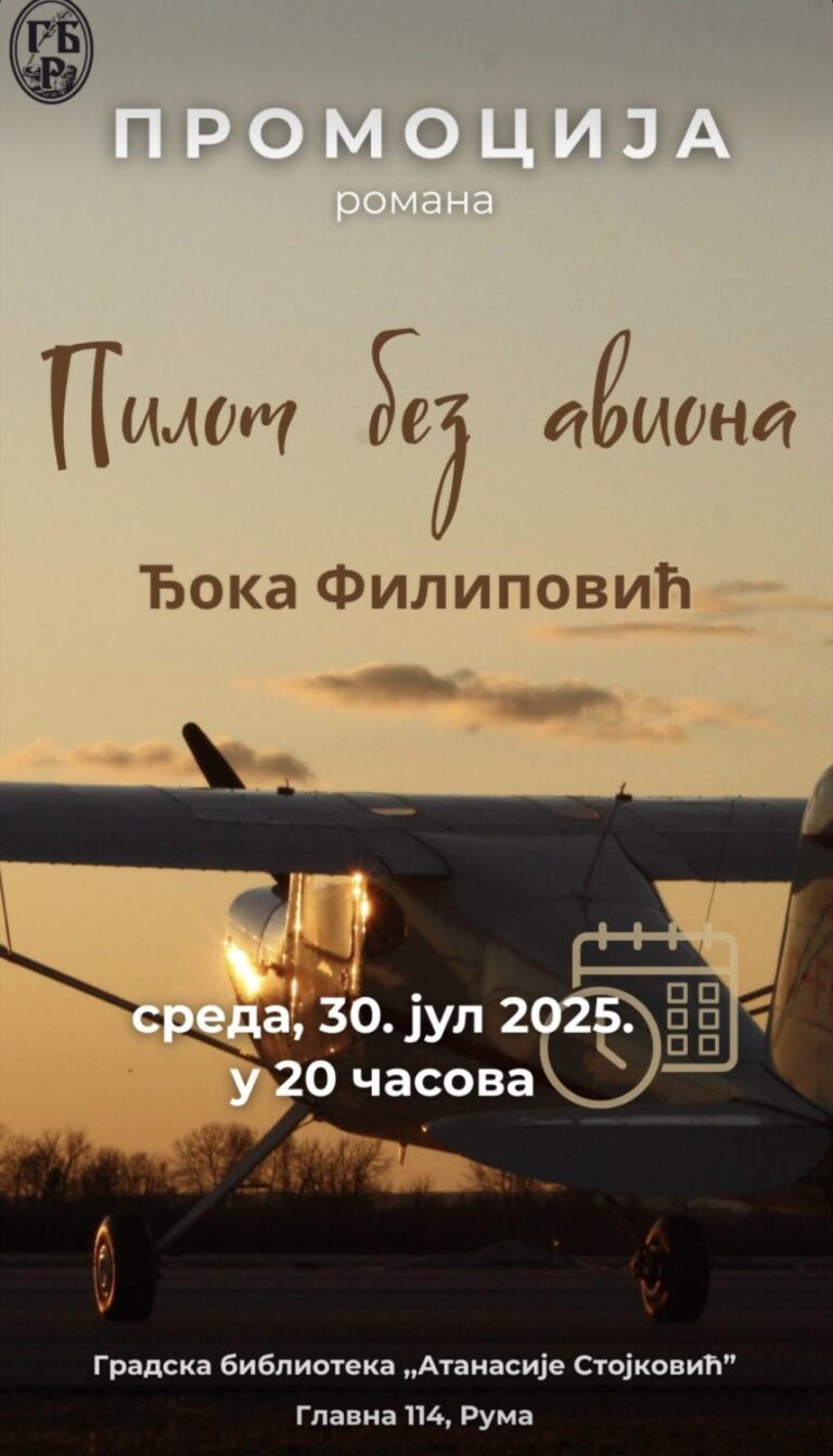 Рума се спрема за књижевни догађај! Градска библиотека „Атанасије Стојковић“ биће домаћин промоције романа под називом „Пилот без авиона“ аутора Ђоке Филиповића. Промоција ће се одржати у…