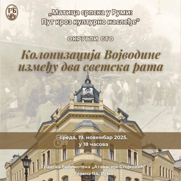 У оквиру програма „Матица српска у Руми: Пут кроз културно наслеђе”, у Градској библиотеци „Атанасије Стојковић” биће одржан округли сто на тему: ✨ „Колонизација Војводине између два…