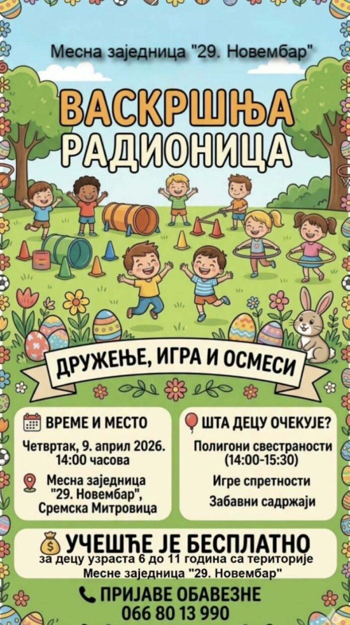 Месна заједница „29. новембар“ у сарадњи са Спортским савезом Града Сремска Митровица организује Васкршњу радионицу на отвореном, која ће бити одржана у четвртак 09. априла са почетком…