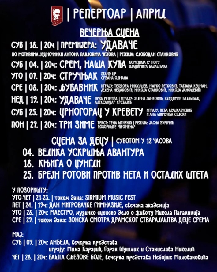 🌼 Априлски репертоар је пред вама, када вас очекује још једна премијера наше куће‼️ 🎭 По Чеховљевим једночинкама „Просидба“ и „Медвед“ настала је комедија „Удаваче“ у режији…