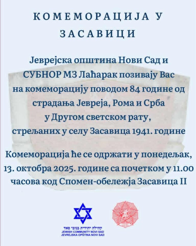 Јеврејска општина Нови Сад и СУБНОР МЗ Лаћарак позивају грађане да присуствују комеморацији у Засавици, која ће бити одржана поводом 84 године од страдања Јевреја, Рома и…