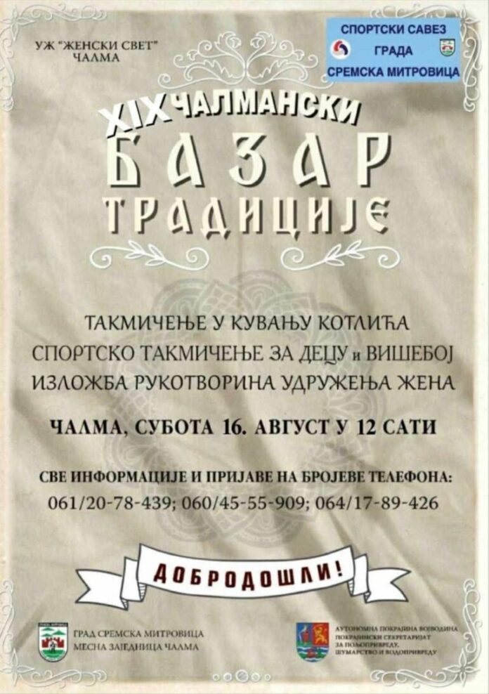 У Чалми се одржава ХIХ Чалмански базар традиције У Чалми ће се у суботу, 16. августа, одржати ХIХ Чалмански базар традиције. Манифестација почиње у 12 часова, а…
