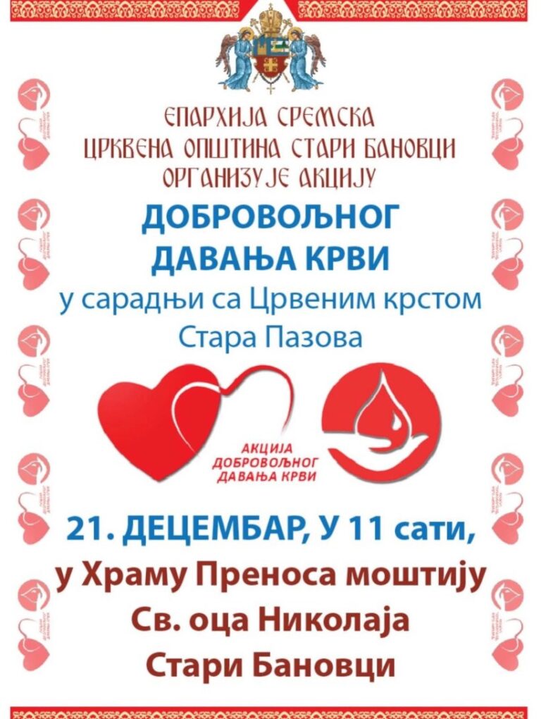 Црквена општина Стари Бановци, у оквиру Епархије сремске, у сарадњи са Црвеним крстом Стара Пазова, организује акцију добровољног давања крви. Акција ће бити одржана 21. децембра, са почетком…