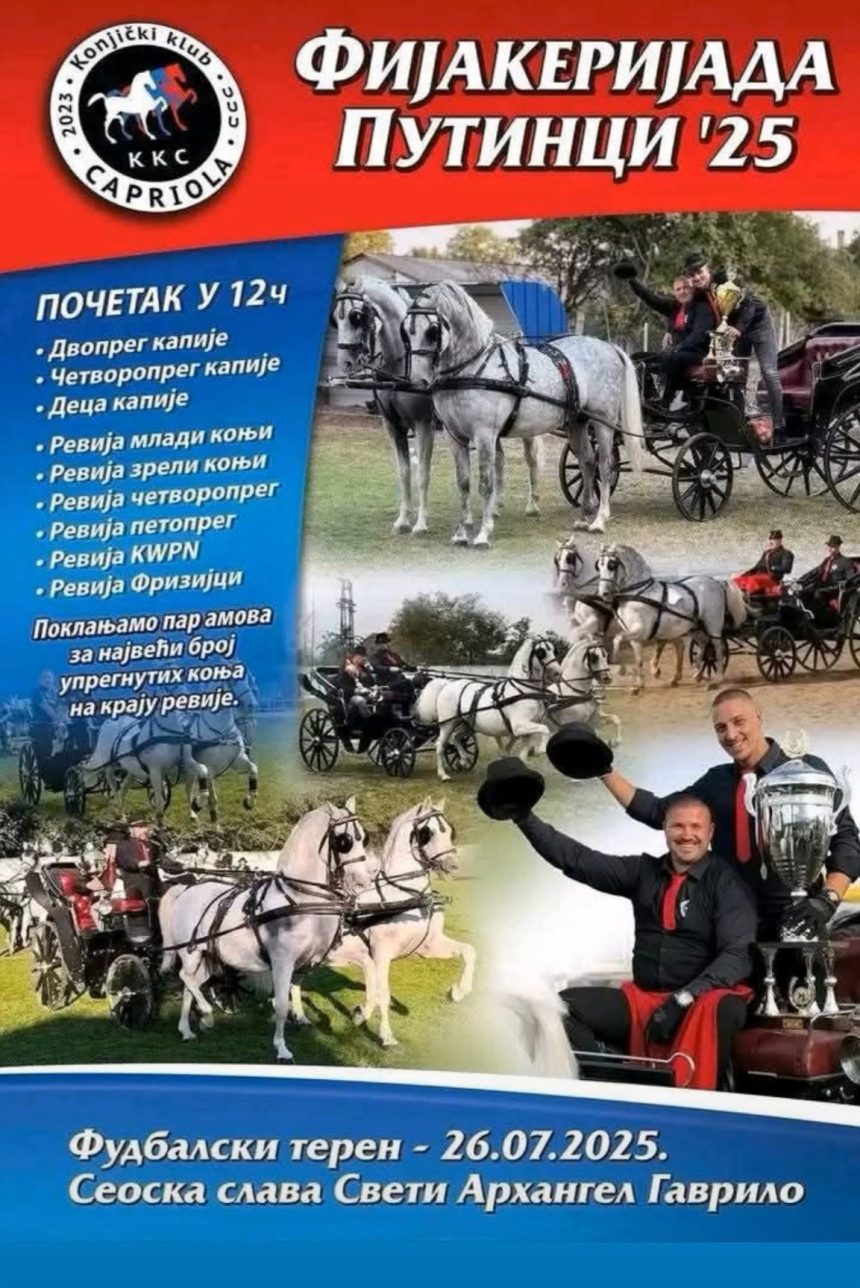 Љубитељи коњарства, традиције и прелепих запрега, припремите се за незабораван дан! У суботу, 26. јула 2025. године, фудбалски терен у Путинцима биће домаћин традиционалне Фијакеријаде „Путинци ’25“, која ће се одржати у склопу обележавања сеоске славе, Светог Архангела Гаврила.