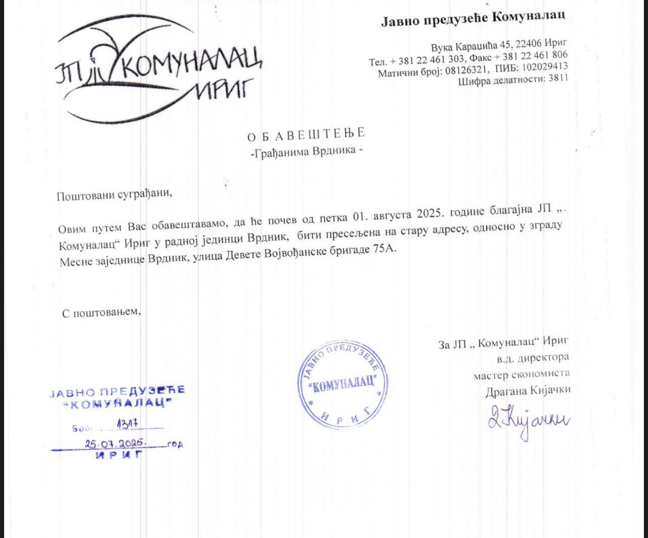 Јавно предузеће „Комуналац“ Ириг обавештава грађане Врдника о важној промени у раду своје пословнице. Почев од петка, 1. августа 2025. године, благајна ЈП „Комуналац“ у Врднику биће пресељена на нову, односно стару адресу.