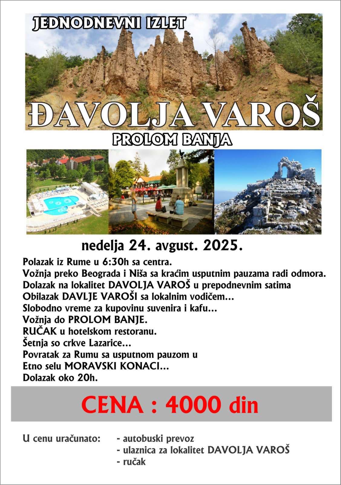 Општинско удружење пензионера Рума, у сарадњи са Туристичком агенцијом „Лајф лепа путовања“ из Новог Сада, организује једнодневни излет у Ђавољу Варош и Пролом бању. Излет је планиран за 24. август.
