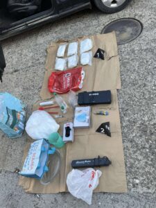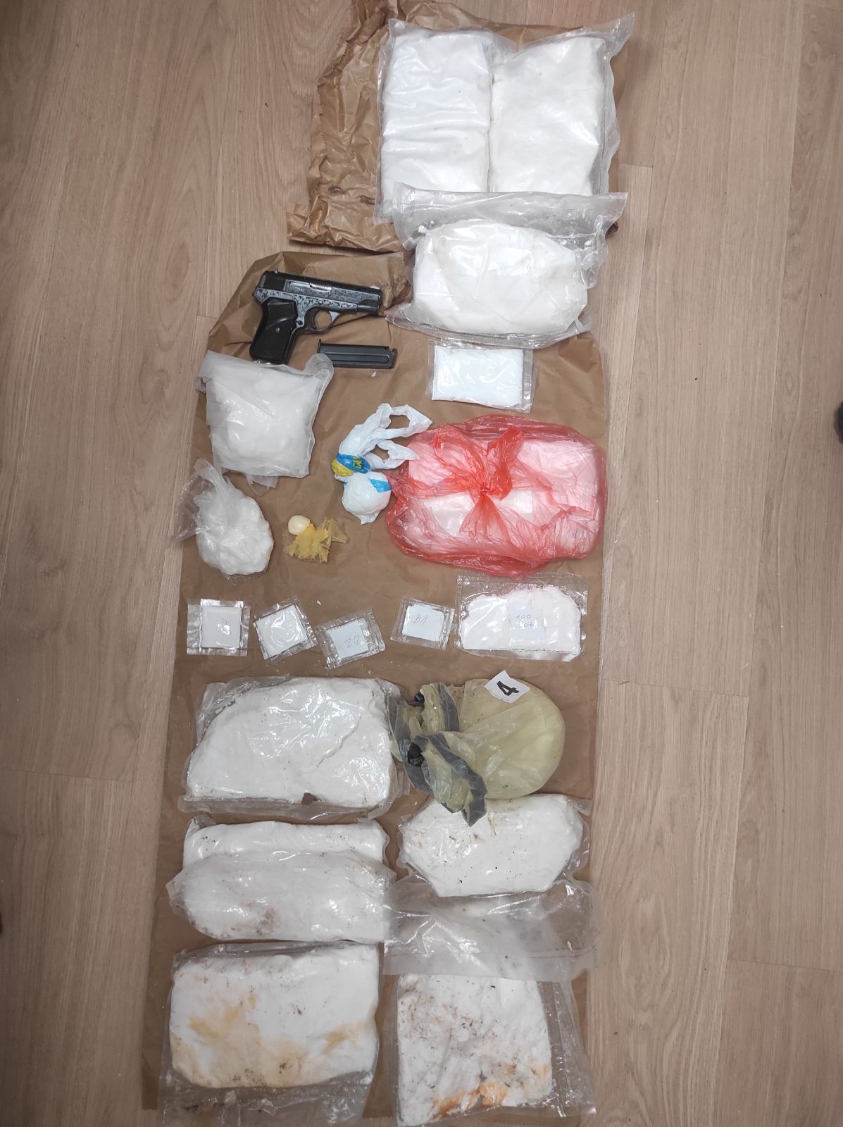 Полиција је приликом прегледа возила којим је осумњичени управљао, као и претресом на две локације, пронашла и одузела више од 18 килограма прашкасте материје за коју се сумња да је амфетамин, 2,5 килограма праха који, како се сумња, служи за увећање масе наркотика, апаратуру за прављење амфетамина, дигиталну вагу и пиштољ.