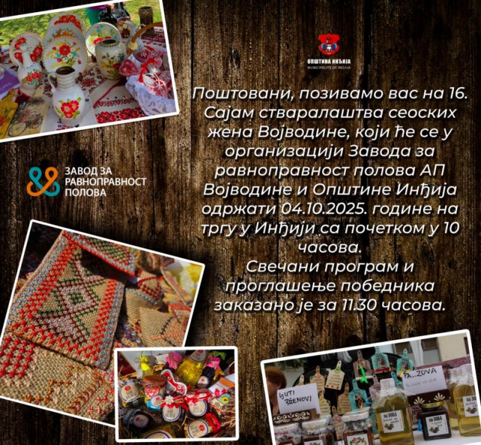 У организацији Завода за равноправност полова АП Војводине и Општине Инђија, у петак 4. октобра 2025. године биће одржан 16. Сајам стваралаштва сеоских жена Војводине.