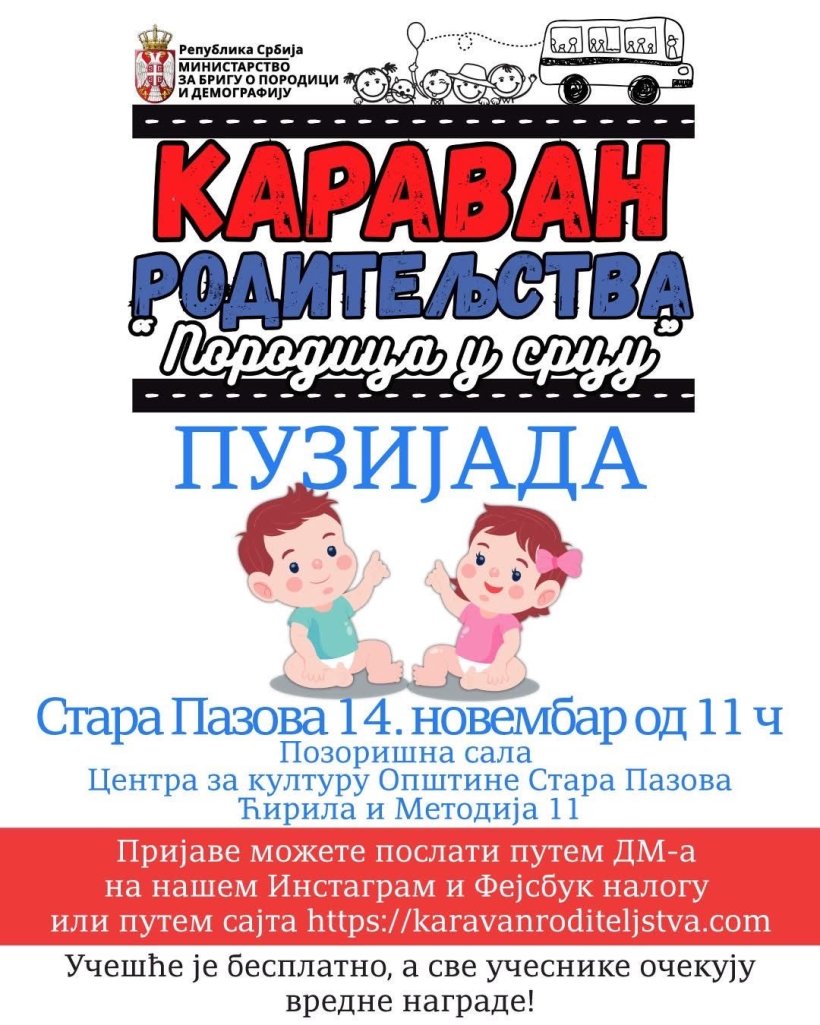 Министарство за бригу о породици и демографију, у сарадњи са Општином Стара Пазова, организује манифестацију „Караван родитељства“ у петак, 14. новембра, са почетком у 11 часова у Позоришној сали у Старој Пазови.