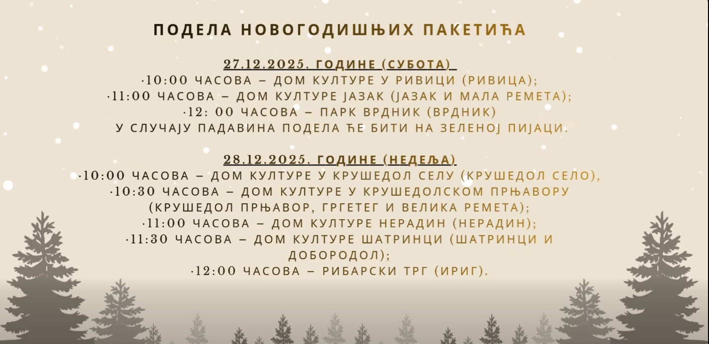 Општина Ириг организује традиционалну поделу новогодишњих пакетића за најмлађе, која ће бити одржана у суботу и недељу, 27. и 28. децембра 2025. године. Пакетићи ће бити подељени у свим местима општине, према следећем распореду: