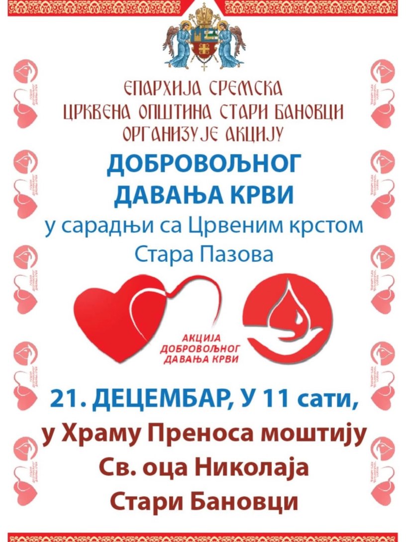 Црквена општина Стари Бановци, у оквиру Епархије сремске, у сарадњи са Црвеним крстом Стара Пазова, организује акцију добровољног давања крви.