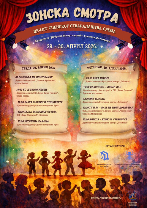 Културни центар „Пећинци“, у сарадњи са Савезом уметничког стваралаштва аматера Војводине, под покровитељством Општине Пећинци и уз техничку подршку Позоришта „Добрица Милутиновић“ у Сремској Митровици, најављује Зонску смотру дечјег сценског стваралаштва, која ће бити одржана 29. и 30. априла 2026. годинена Великој сцени митровачког позоришта.
